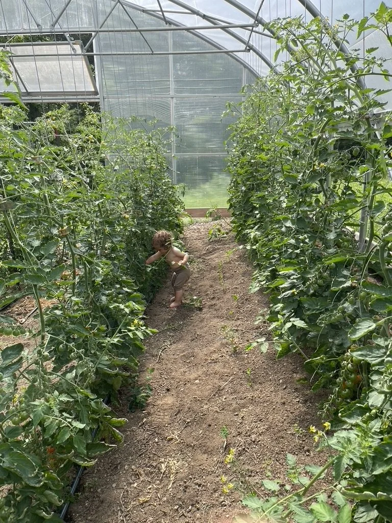 On the days where my daughter and me spend the day together we’re often at the farmlet in the morning and afternoon but go out and about in the middle of the day (library, park, meetup). It’s amazing to have her at this age- on her own two feet exploring the farm a lot of the day. I’ll take her out to do a small task (like opening all the tunnels) and see if anything interests her, and follow her lead, try challenge myself to not lose interest before she does. Meandering around the farm, finding bugs, flowers, dirt clods, finding super sweet tomatoes to gorge on or identifying and pulling weeds and singing songs.