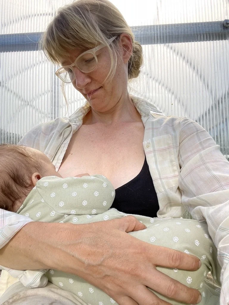 Breastfeeding got easier after a couple months and we found a rythym where Josh would bring baby out to the field to nurse or I would come in. It usually felt like a welcome break. A release of oxytocin and a way to check in on things with the family. Our daughter lost interest in the bottle at this time and that did limit our options for being apart for too long. The first year I was never away from her for more than three hours.
